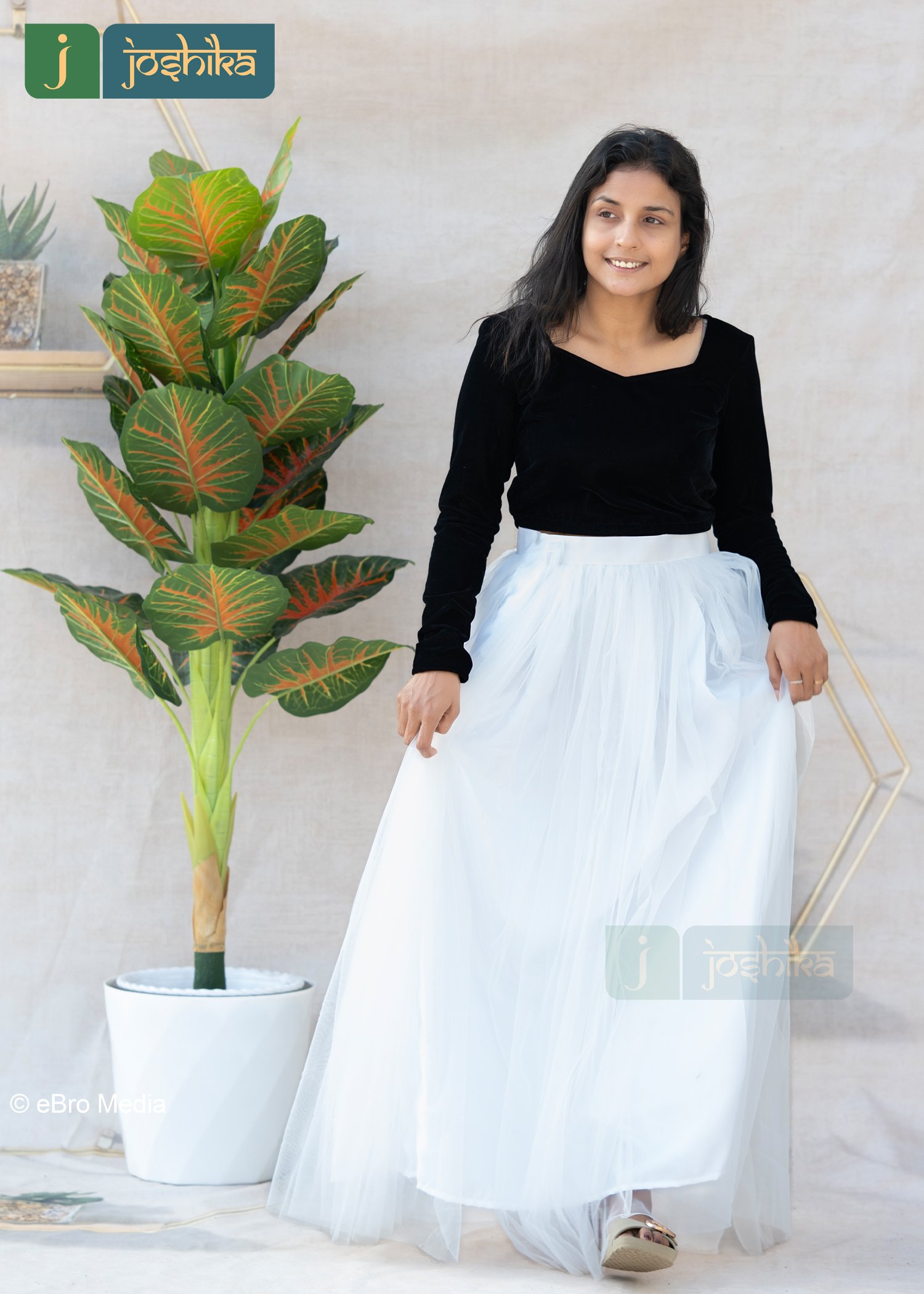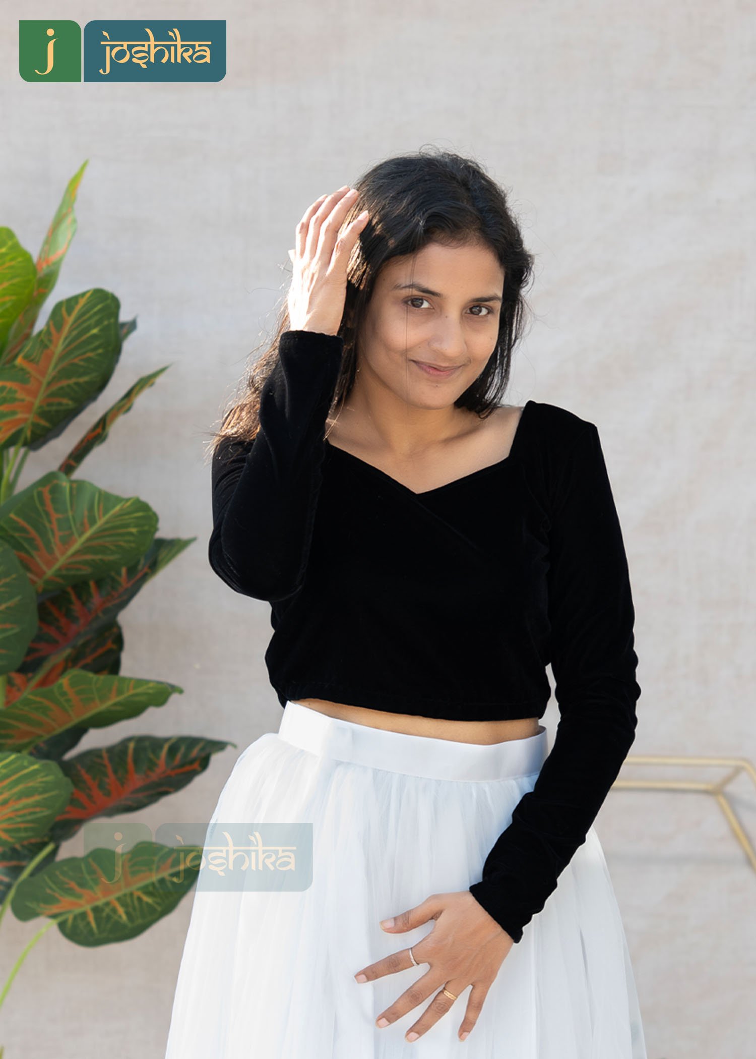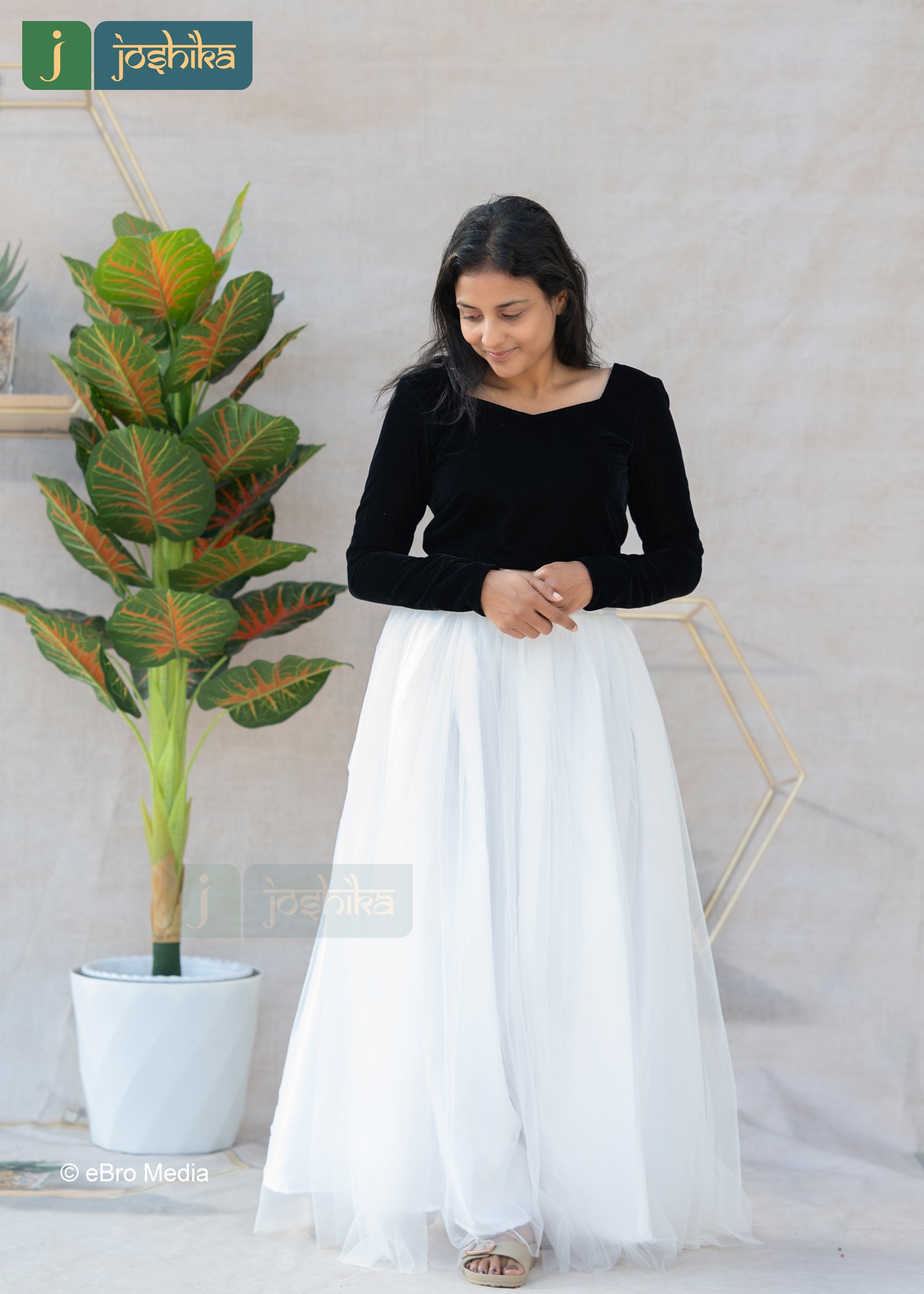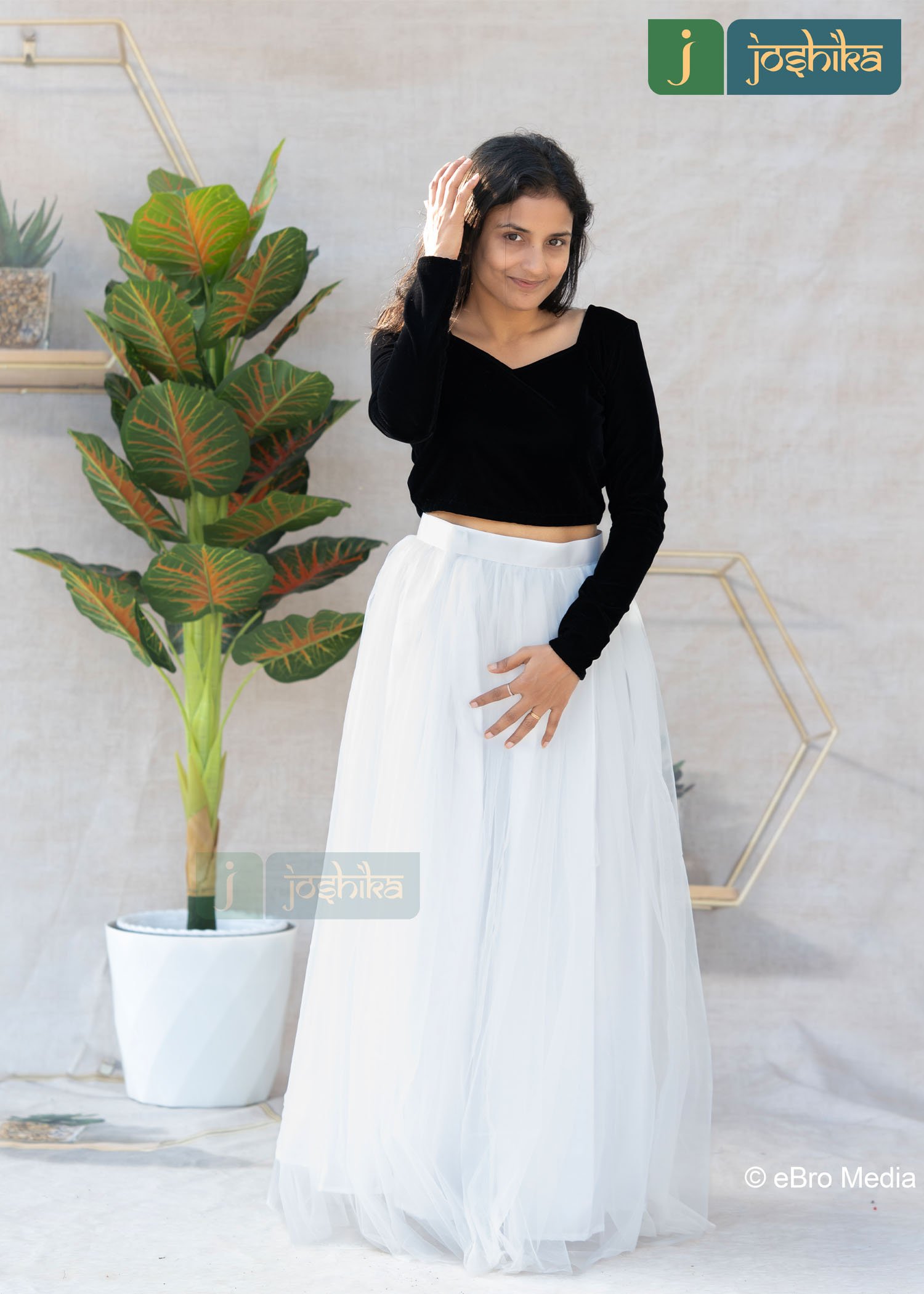 A timeless blend of elegance and charm, this ensemble features a rich velvet crop top paired with a beautifully flared white net skirt. The soft velvet adds a luxe touch, while the airy net skirt creates effortless movement and grace. Perfect for festive evenings, intimate celebrations, or stylish day events, this outfit strikes the perfect balance between modern and classic.