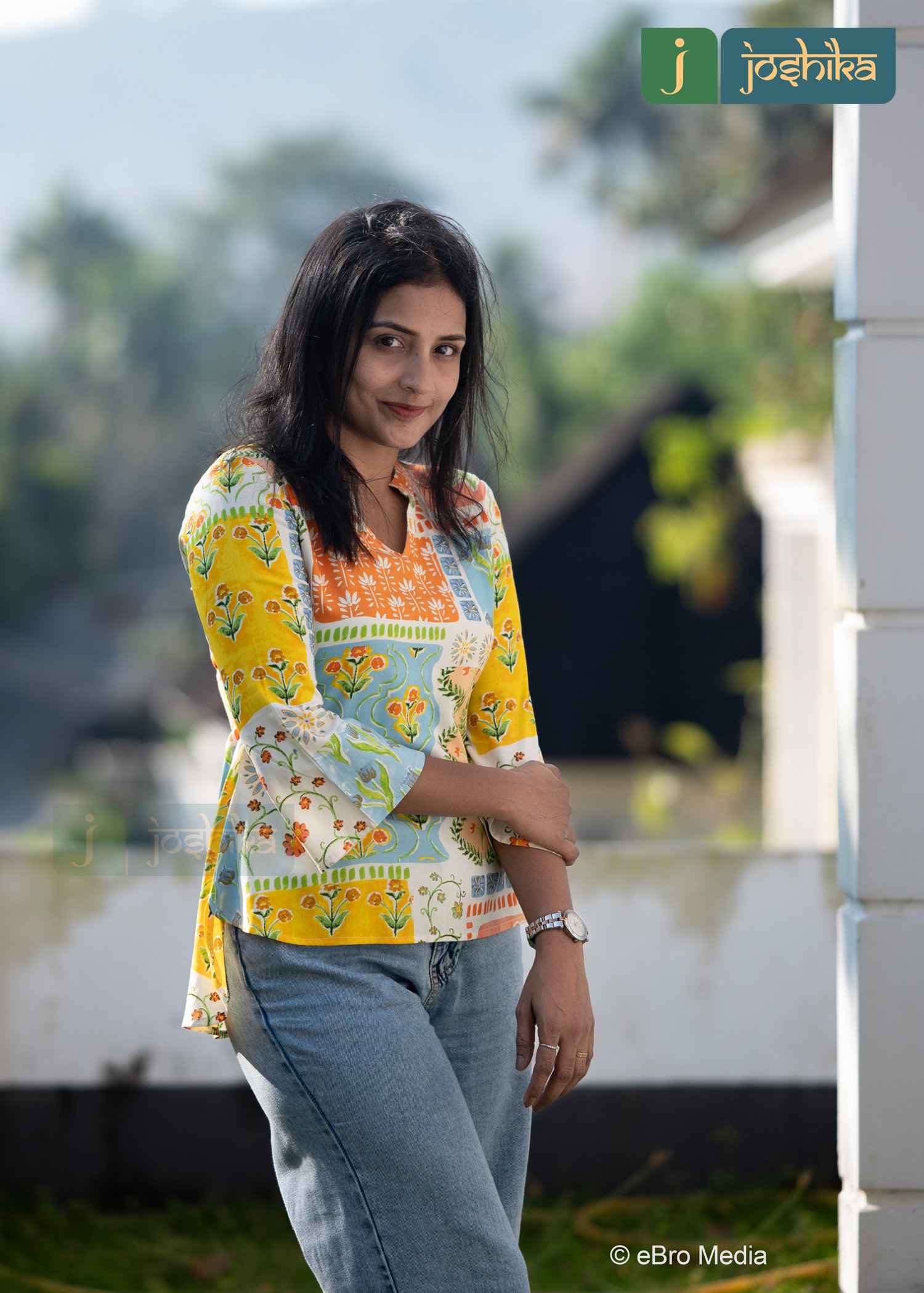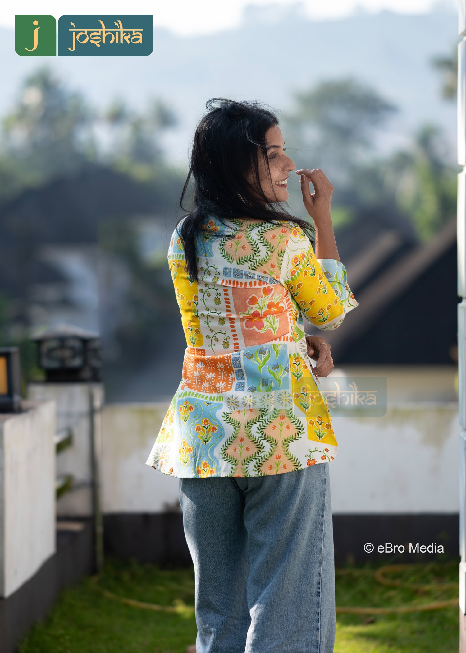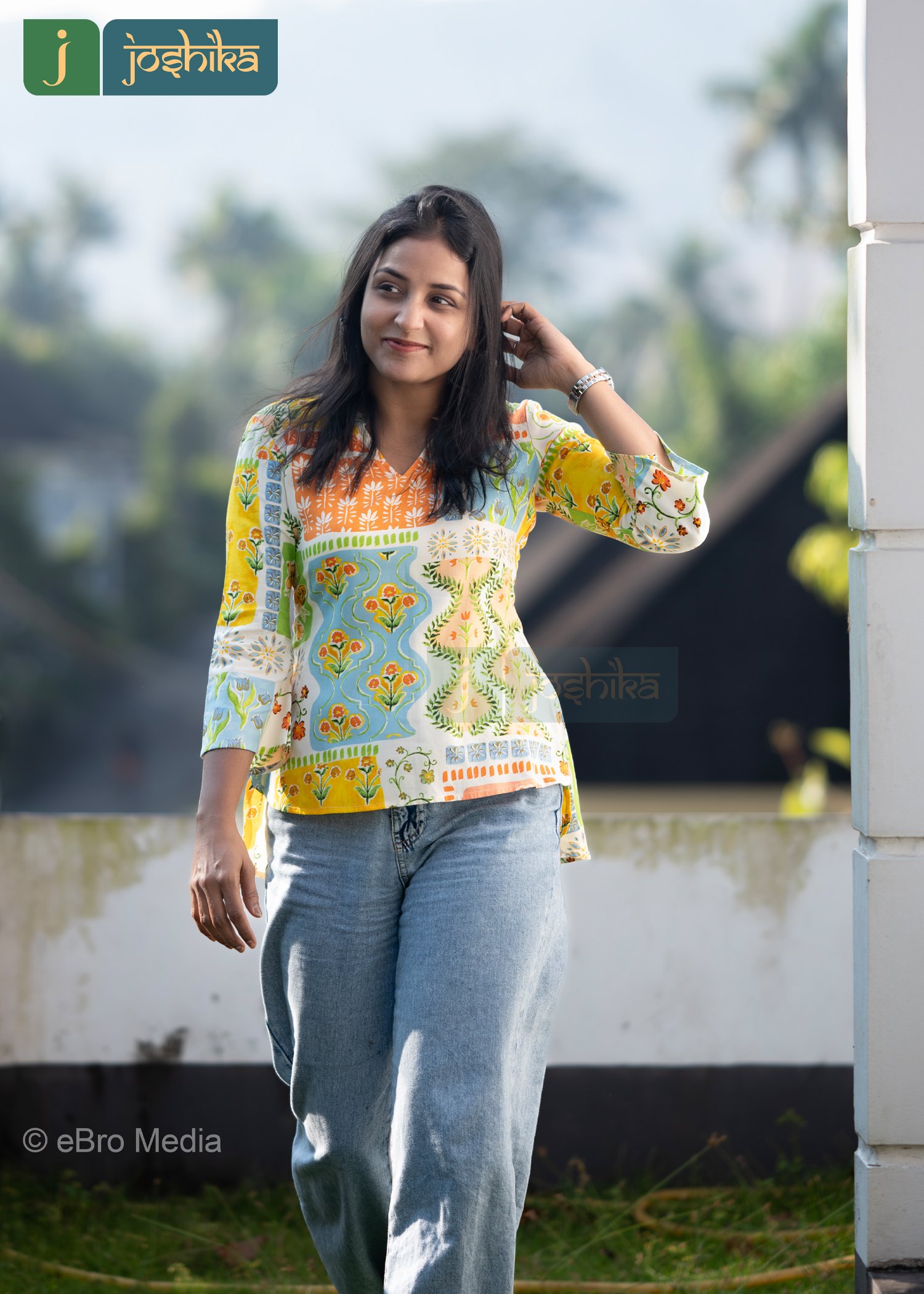 Add a pop of color to your everyday style with this vibrant printed short top. Designed with a flattering fit and crafted from soft, breathable fabric, it features a lively mix of traditional- inspired prints that bring afresh , cheerful look. Three quarter sleeves and comfortable silhouette make it perfect for casual outings, work- from home days, or relaxed weekends. Pair it effortlessly with jeans ,trousers, or skirts for an easy, stylish ensemble.