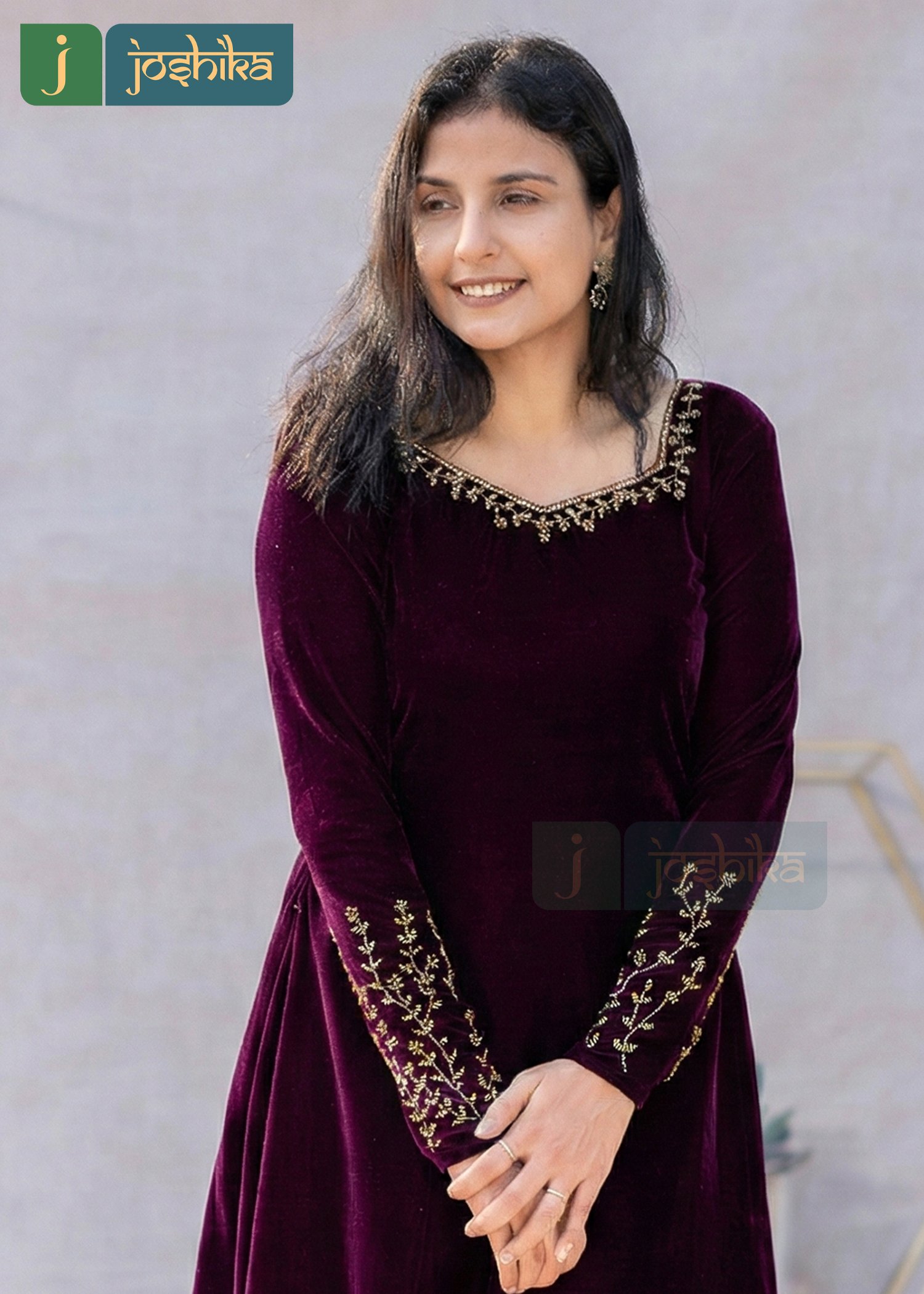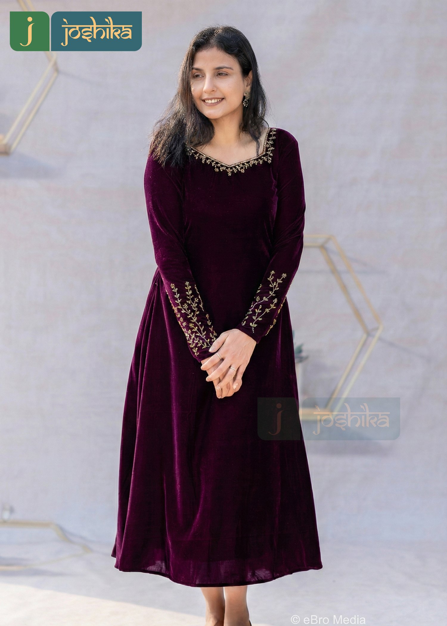 Make a graceful statement with this wine red A-line dress, crafted in rich velvet for a luxurious feel. Designed with a flattering flowy silhouette , the dress features delicate hand embroidery along the neckline and sleeves, adding a touch of traditional elegance .The soft velvet fabric drapes beautifully, making it perfect for festive occasions, evening gathering, and special celebrations.