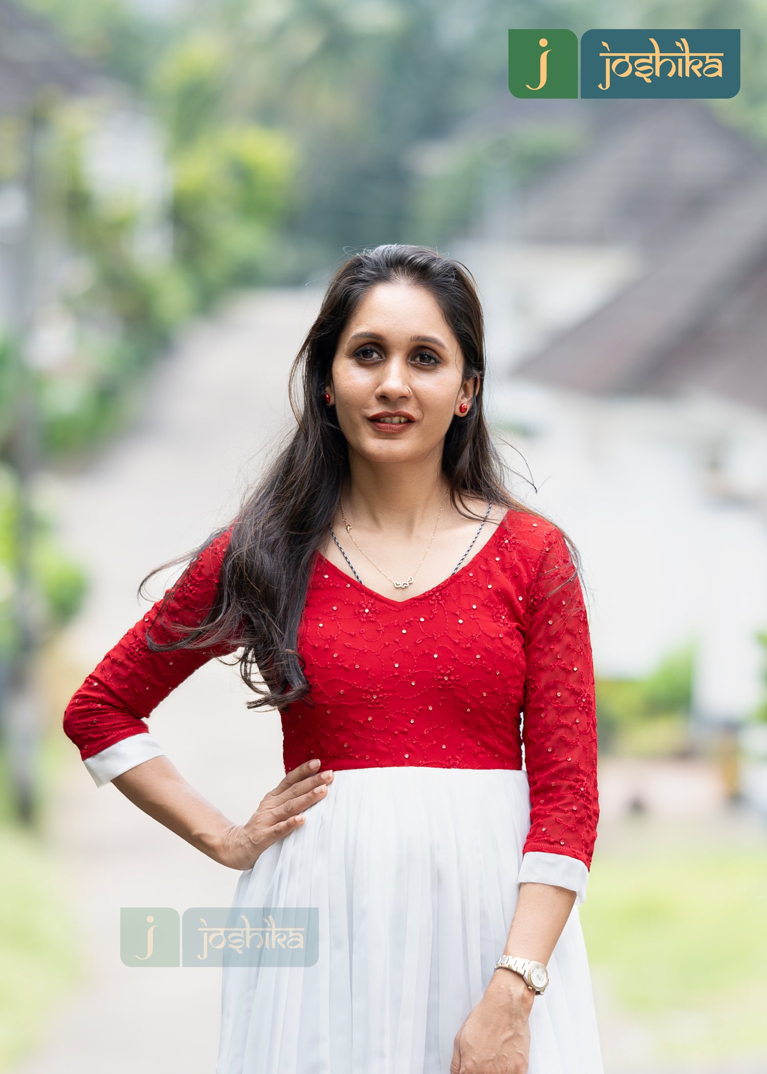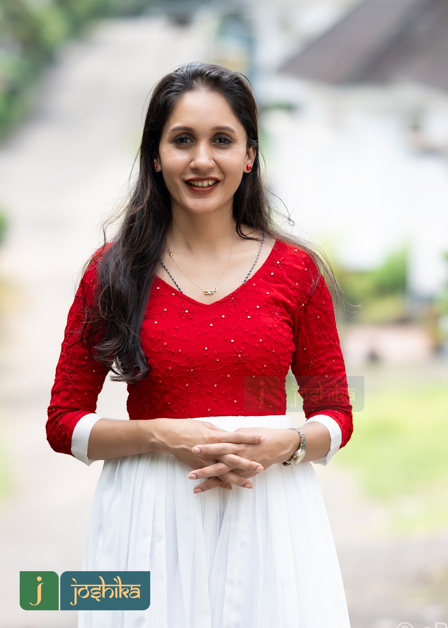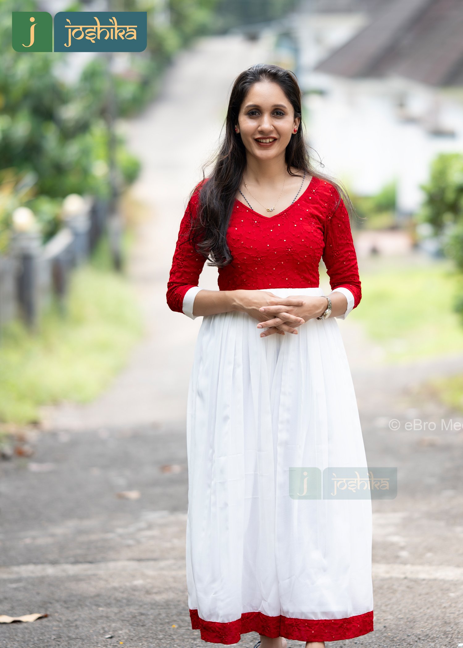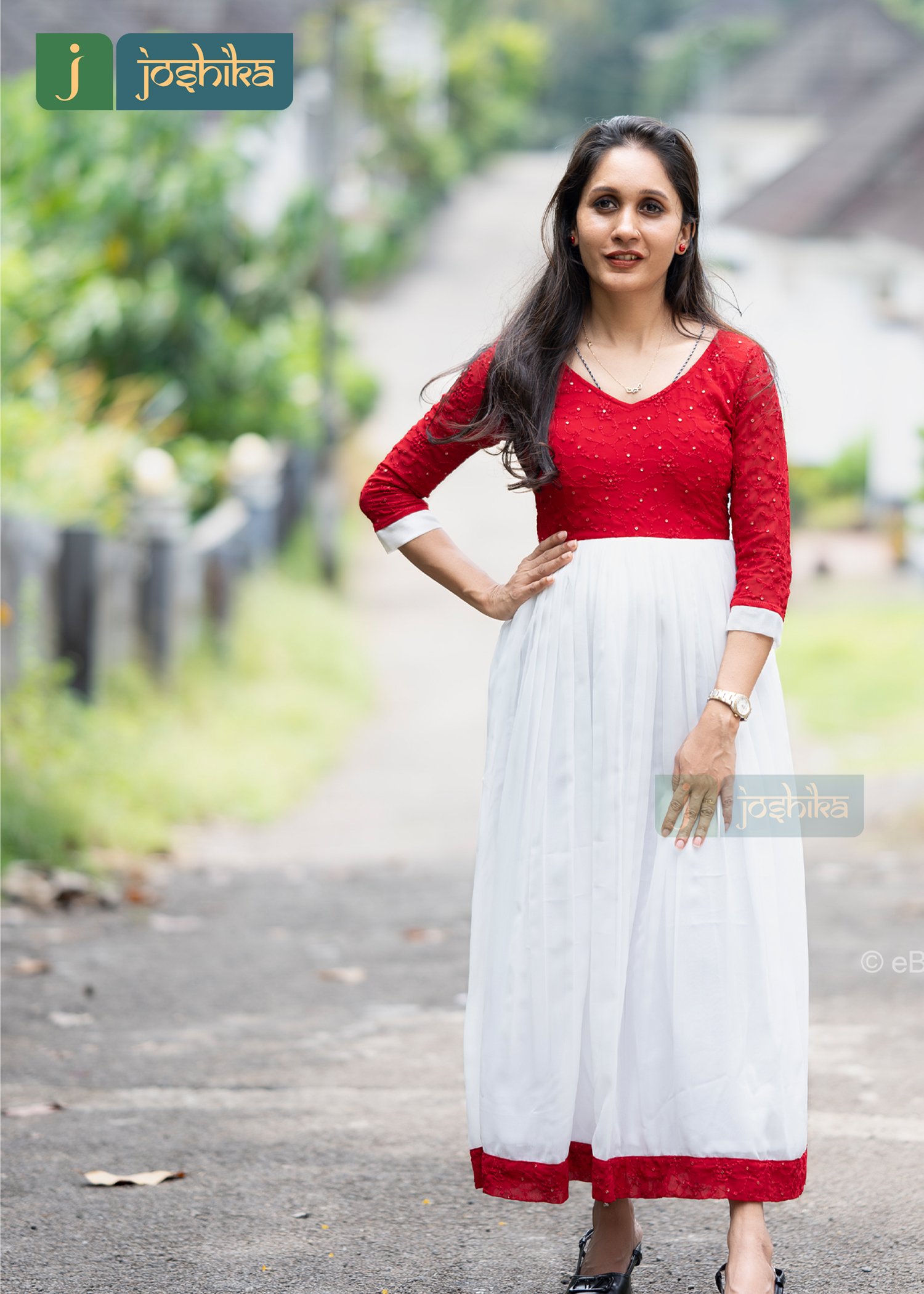 The kurta has a contrast of red and white colors, creating a visually appealing look. The red top has a round V neck and is adorned with what seems to be small embellishments. yoke part is red and 3/4th sleeves.