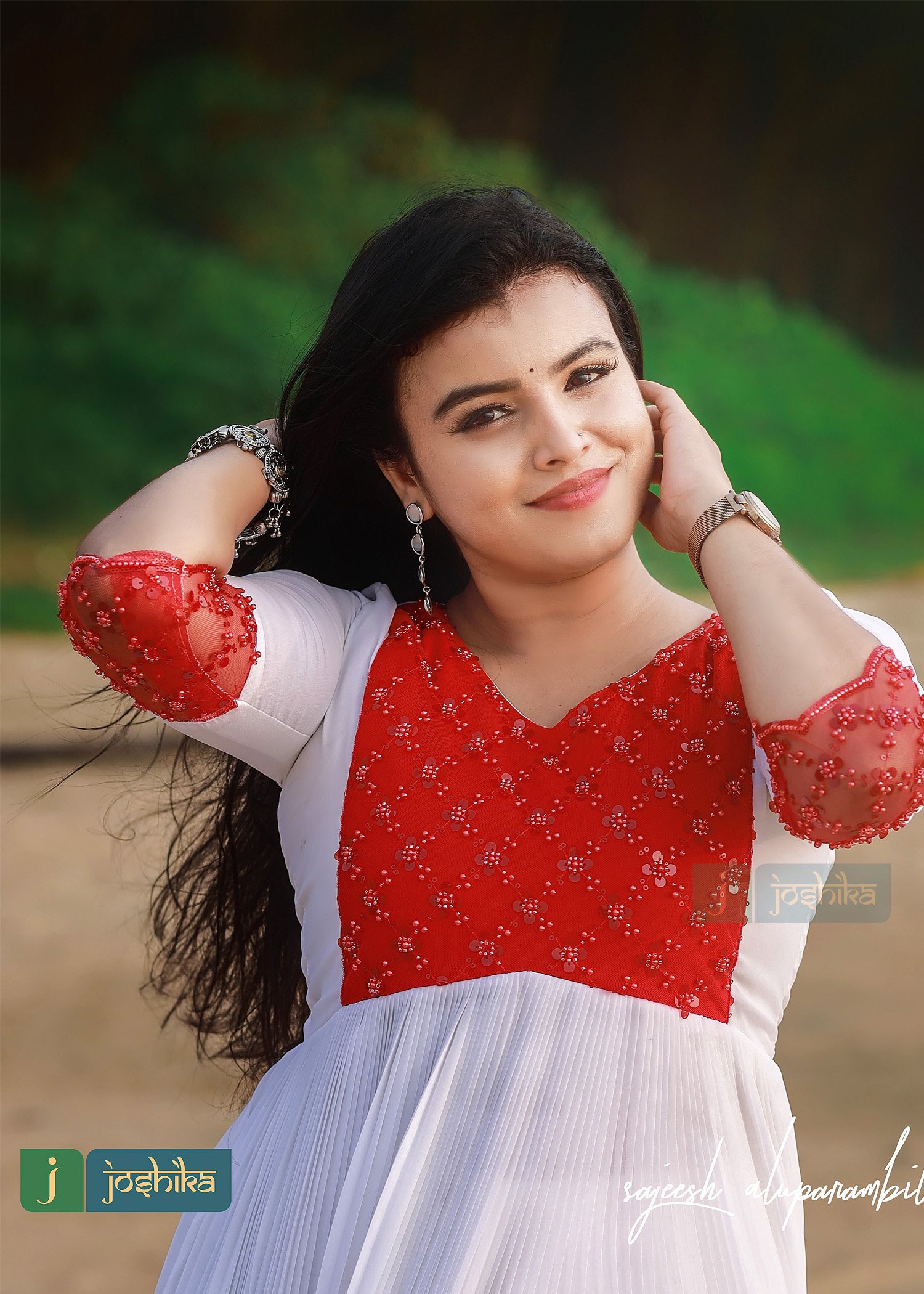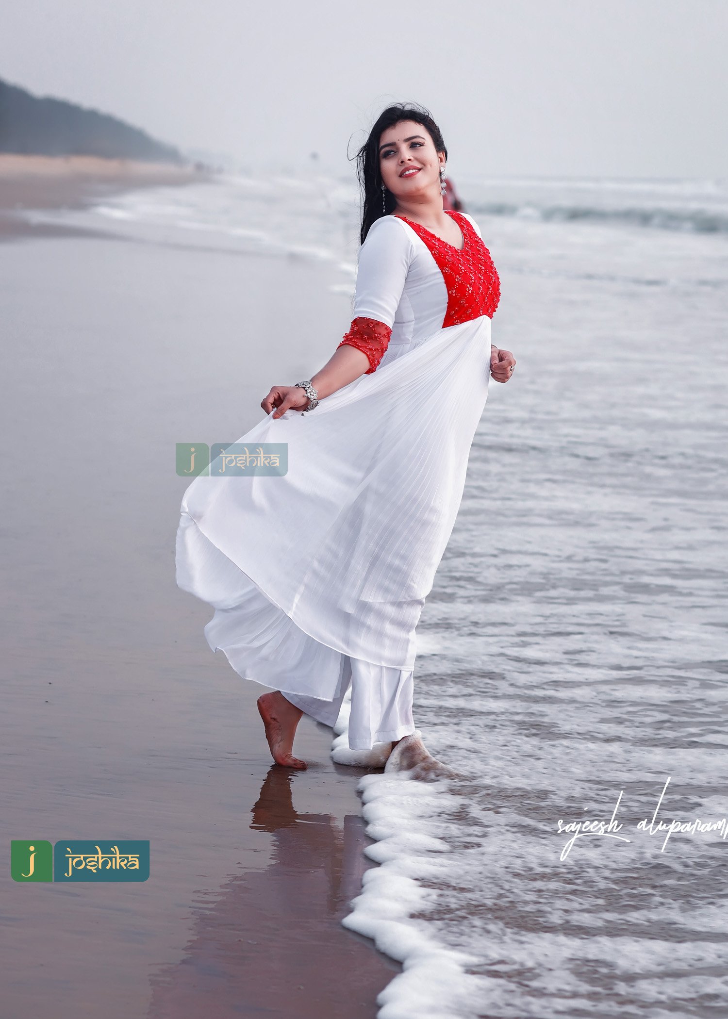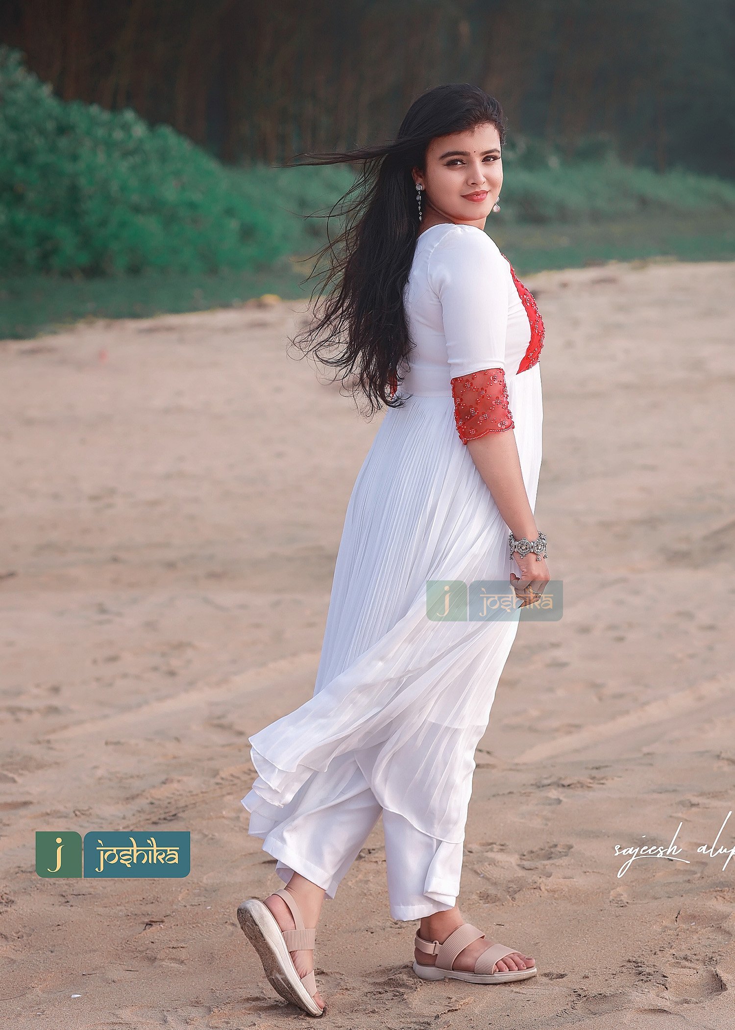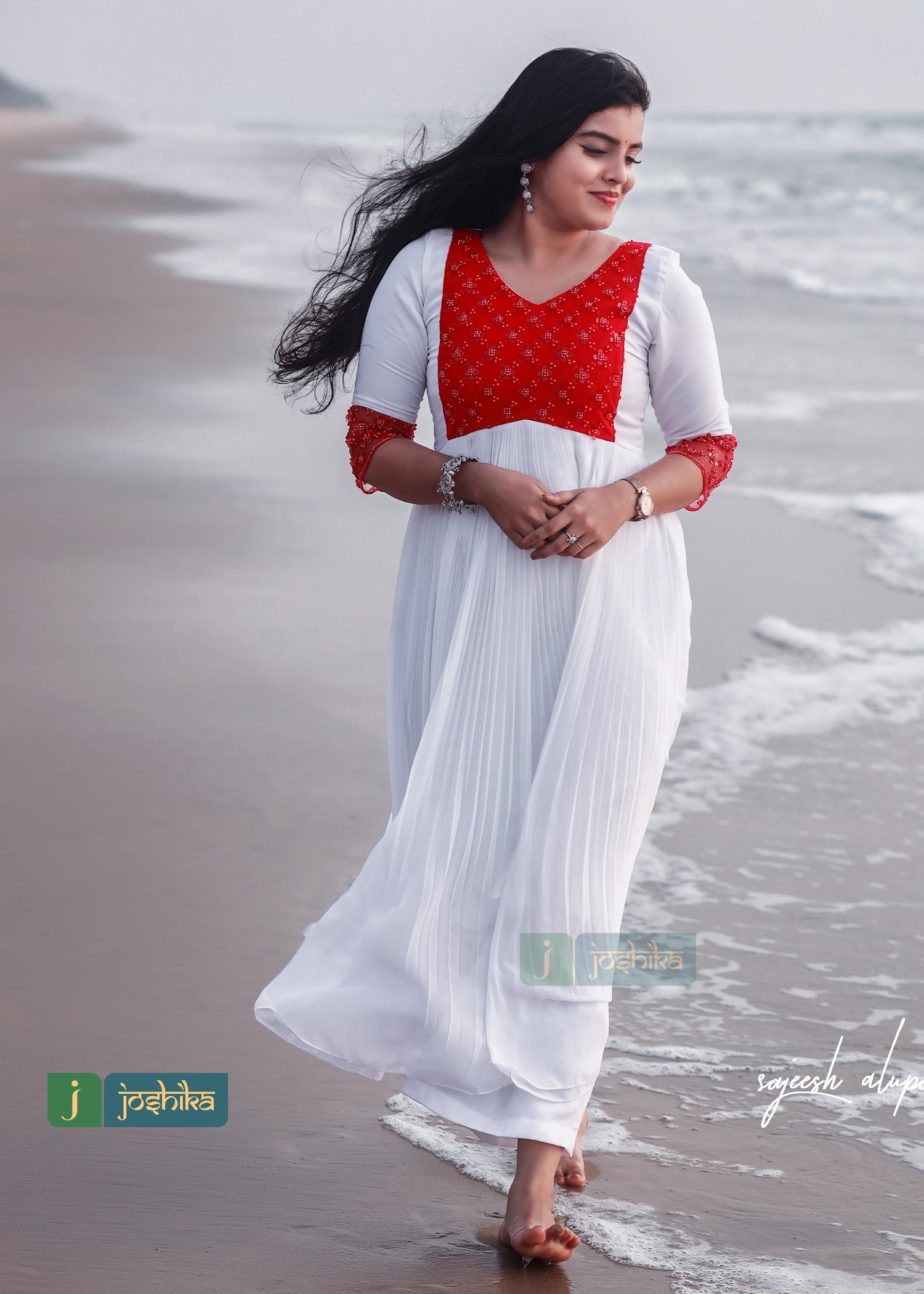 Pleated georgette kurta with beaded red color net yoke.